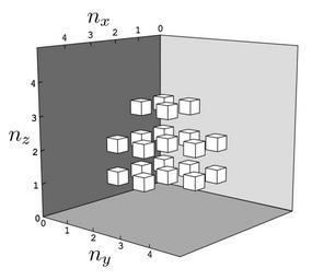 | Keywords: Aufbau Principle 3D (20 States).svg A diagram of the state space of a 3D quantum well with the first 20 states by energy shown every state closer than 4 2 units to the origin self-made Inkscape Inductiveload Mathematica Code This code reuqire you to load the module << Graphics`Polyhedra` <pre><nowiki> a Table x y z x 1 5 y 1 5 z 1 5 ; a Flattena 2; a Select a Sqrt 1 2 + 2 2 + 3 2 < 4 2 ; Show Table PolyhedronCube an 0 3 n 0 Lengtha ViewPoint -> 3 5 3 1 Shading -> False PlotRange -> 0 5 0 5 0 5 Axes -> True </nowiki></pre> Aufbau principle 3D computer graphics |