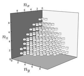 | Keywords: Aufbau Principle 3D (232 States).svg The state space of a 3D potential wel with the first 232 states shown You can see the increasing approximation to a sphere self-made Inkscape 05/08/2007 Inductiveload Mathematica Code Require the following module << Graphics`Polyhedra` <pre><nowiki> a Table x y z x 1 10 y 1 10 z 1 10 ; a Flattena 2; a Select a 1 2 + 2 2 + 3 2 < 70 ; Show Table PolyhedronCube an 0 3 n 0 Lengtha ViewPoint -> 3 5 3 1 Shading -> False PlotRange -> 0 10 0 10 0 10 Axes -> True </nowiki></pre> Aufbau principle 3D computer graphics |