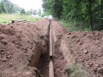 | Keywords: Aufschluss Wilisch 001.JPG de Temporärer geologischer Aufschluss ca 300 m westlich des Basaltvorkommens Wilisch Ostrand des Osterzgebirges Aufschlussart Teilstück eines Rohrleitungsgrabens; Zugänglichkeit Mitte Juli 2015; Tiefe ca 1 5 m unter Flur; Breite ca 0 5 m; Länge ca 100 m; Richtung etwa NE-SW; aufgeschlossenes Gestein Orthogneis am Grunde anstehend darüber Verwitterungsschutt und Boden en Section of a pipeline trench about 300 m west of the hilltop of Wilisch mountain eastern margin of Eastern Ore Mountains Saxony Germany The depth of the trench is about 1 5 m below surface width is about 0 5 m length of the photographed section is about 100 m the direction is approximately NE-SW The trench exposes orthogneiss so called red gneiss at its bottom with regolith and soil above own 2015-07-12 Epipactis Wilisch Geology of Saxony Pipelines in Germany Cc-zero |