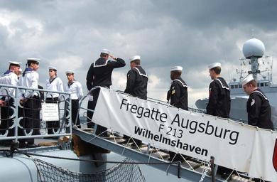 | Keywords: Augsburg 020621-N-0872M-501.jpg en Sailors from the guided missile cruisers USS Cape St George CG 71 and USS Anzio CG 68 visit with sailors from the German Frigate Augsburg F 213 to watch the World Cup soccer match between their two respective countries Both ships are in Kiel Germany for a port visit at the conclusion of BALTOPS 2002 The United States and 11 other nations are participating in this year's exercise BALTOPS 2002 is intended to improve interoperability between allies and Partnership for Peace countries by conducting a peace support operation at sea including exercises in gunnery replenishment-at-sea undersea warfare radar tracking mine countermeasures seamanship search and rescue maritime interdiction operations and scenarios dealing with potentially real world crises http //www navy mil/view_image asp id 1758 U S Navy photo by Photographer's Mate 1st Class Martin E Maddock 2002-06-21 PD PD-USGov-Military-Navy BALTOPS 2002 Bundeswehr in 2002 June 2002 photographs F213 Augsburg ship 1989 People of the Deutsche Marine Ceremonies of the Deutsche Marine Salutes |