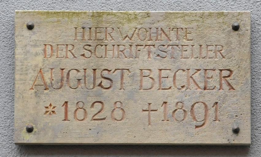 | Keywords: August-Becker-CTH.JPG de Gedenktafel am Wohnhaus von August Becker Eisenach Schmelzerstr 18 own CTHOE 2015-03-21 other fields 1 inscription inscription HIER WOHNTE<br />DER SCHRIFTSTELLER<br /><big>AUGUST BECKER<br /> 1828 1891</big> de 50 58 4217 0 N 10 19 341 0 E alt 240_source exif_heading August Becker writer Cc-zero |