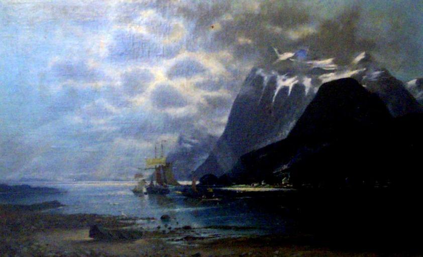Keywords: August Becker norwegian fjord.jpg en Painting of an unknown norwegian fjord; painted during a tour to Norway in 1844 own by Sukuru August Becker 1821 “1887 1844 PD-old August Becker painter Paintings of Norwegian fjords 1844 paintings