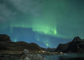 Keywords: aurora borealis lofoten norway night beach costa winter blue green auroras boreal