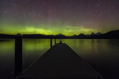 Keywords: aurora borealis night northern lights scenic water reflection silhouettes dock pier atmosphere phenomenon dark ionosphere magnetic celestial landscape solar discharge glow sky glacier national park montana lake mcdonald usa
