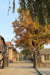 Keywords: auschwitz gateway alley extermination camp concentration camp labour camp death the museum monument autumn tree yellow leaves foliage nature