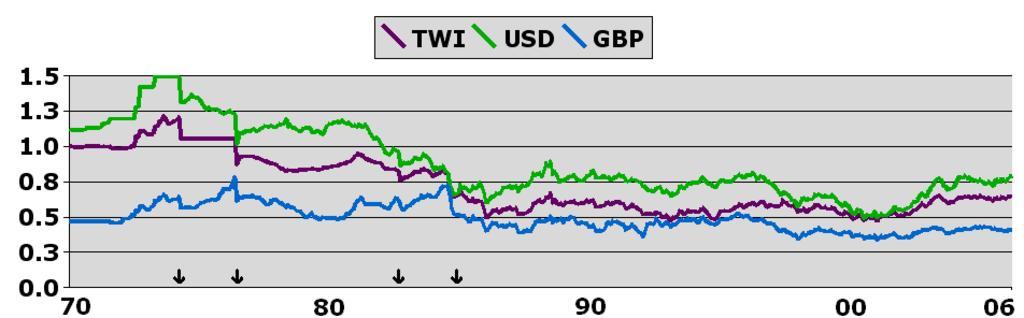 | Keywords: Aussie exchange rates.png Australian dollar exchange rate vs US Dollar green British Pound blue and a basket of the 24 main trading partners' currencies Trade Weight Index TWI purple Arrows from left to right 1974 change from moving dollar peg to TWI fixed peg; 1976 switch to moving TWI peg; 1983 float; 1986 Banana republic crisis <br/> Taux de change du Dollar australien contre le Dollar US vert la Livre sterling bleu et un panier des 24 principaux partenaires commerciaux du pays TWI violet Flèches de gauche à droite 1974 changement d'indexation du dollar US index flottant au panier TWI fixe; 1976 panier fixe devient mobile; 1983 flottation complète; 1986 crise de la république bananière <br/> Source Reserve Bank of Australia 2007-02-11 own assumed Popo le Chien Economic charts of Australia Pound Sterling exchange rate charts Money of Australia United States dollar exchange rate charts |
