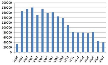 | Keywords: Austin-MG Metro, Rover Metro & Rover 100 production.png en Chart showing Austin/MG Metro Rover Metro and Rover 100 production from 1980 to 1997 it Grafico che mostra la produzione di Austin/MG Metro Rover Metro e Rover 100 dal 1980 al 1997 own based on figures from http //www aronline co uk/blogs/2011/08/25/history-production-figures/ aronline co uk Alessandro Antonelli 2010-05-17 Rover Metro - Rover 100 production png wikitable + Figures Year Production - 1980 32954 - 1981 165745 - 1982 174666 - 1983 180763 - 1984 150917 - 1985 174666 - 1986 158546 - 1987 161285 - 1988 144701 - 1989 138751 - 1990 109605 - 1991 81422 - 1992 79600 - 1993 79677 - 1994 76821 - 1995 81782 - 1996 46118 - 1997 40199 cc-zero Bar charts Austin/MG/Rover Metro/100 |