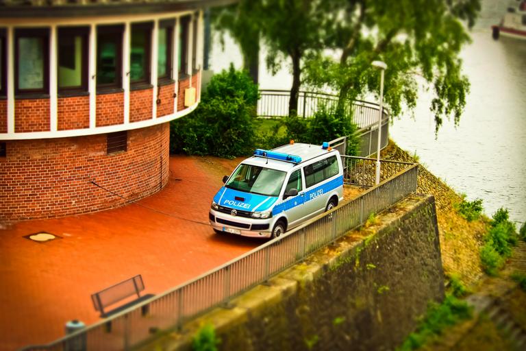 Keywords: auto police police car patrol car blue light vehicle vw blue dare park bill right law tilt shift miniature effect port protection help protective düsseldorf