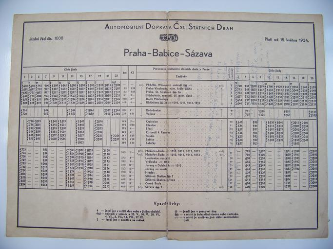 | Keywords: Autobusový jízdní řád ČSD 1008 Praha - Babice – Sázava 1934.jpg  Jízdní řád autobusové linky Československých státních drah č 1008 Praha  Babice  Sázava platný od 15 května 1934 Výstavka v rámci akce 10 let PID na Černokostelecku Kostelec nad Černými lesy okres Praha-východ areál firmy POLKOST Bus timetable of Czechoslovak State Railways from 1934 Open Doors Day of POLKOST company Kostelec nad Černými lesy Prague-East District Central Bohemian Region the Czech Republic 2010-10-02 Photo own Source exhibition 10 let PID na Černokostelecku Československé státní dráhy Photo by ŠJů cs ŠJů PD-text 10 let PID na Černokostelecku Bus transport of ČSD Bus timetables in the Czech Republic Bus transport in Central Bohemian Region Long-distance buses in Prague |