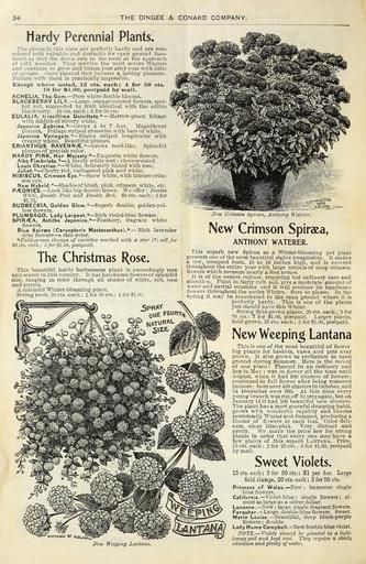 | Keywords: Autumn 1900 (16476827246).jpg 34 <br> THE DINGEE CONARD COMPANY <br> Hardy Perennial Plants <br> The plants in this class are perfectly hardy and are con- <br> sidered both valuable and desirable tor open ground inas- <br> much as they die down only to the roots at the approach <br> of cold weather They survive the most severe Winters <br> and continue to grow and bloom year after year with little <br> or no care Once planted they become a lasting pleasure <br> Failure Avith them is practically impossible <br> Except -where noted 15 cts each; 4 for 50 cts <br> 10 for 1 00 postpaid by mail <br> ACHELiA The Gem Pure white double blooms <br> BLACKBERRY LILY Large orange-colored flowers spot- <br> ted red succeeded by fruit identical with the edible <br> blackberry 10 cts each ; 6 for 50 cts <br> EULALIA Gracillima Univittata Marrow-green foliage <br> with midrib of silvery white <br> Japonica Zebrina Grows 4 to 7 feet Magnificent <br> plumes Foliage striped crosswise with bars of white <br> Japonica Variegata Blades striped lengthwise with <br> creamy white Beautiful plumes <br> ERIANTHUS RAVEN N/E -Grows reed-like Splendid <br> plumes of gravish color <br> HARDY PINK Her Majesiy Exquisite white flowers <br> Alba Fimbriaia A lovely white sort; clove-scented <br> Louis Chretien White delicately tinted with rose <br> Juliei Cherry red variegated pink and white <br> HIBISCUS Crimson Eye Snow white with intense crim- <br> son eye <br> New Hybrid Shadesof blush pink crimson white etc <br> P/EON I ES Look like big double Roses We offer Double <br> White Double Pink and Double Red 60 cts each ; 3 for <br> SI 75 <br> RUDBECKIA Golden Glow Superb double golden-yel- <br> low flowers <br> PLUMBAGO Lady Larpeni Rich violet-blue flowers <br> SPIR/EA Astilbe Japonica Feathery fragrant white <br> flowers <br> Blue Spiraea Caryopteris Masiacanthus Rich lavender <br> blue flowers a rare color <br> Field-grown clumps of varieties marked with a star sell for <br> 85 cts each; 3 for 1 00 postpaid <br> The Christmas Rose <br> This beautiful hardy herbaceous plant is exceedingly rare <br> and scarce in this country It has handsome flowers of splendid <br> size ranging in color through all shades of white red rose <br> and purple <br> A splendid Winter -blooming plant <br> Strong roots 30 cts each ; 2 for 50 cts ; 4 for S1 00 <br> New Weeping Lantana <br> New Crimson Spiraea Anthony Waterer <br> New Crimson Spiraea <br> ANTHONY WATERER <br> This superb new Spirsea as a Winter-blooming pot plant <br> presents one of the most beautiful sights imaginable It makes <br> a low compact bush 15 to 18 inches high and is covered <br> throughout the entire year with large umbels of deep crimson <br> flowers which measure nearly a foot across <br> It is of the easiest culture requiring but ordinary care and <br> attenticn Plant in fairly rich soil give a moderate amount of <br> water and partial sunshine and it will produce its handsome <br> flowers throughout the entire Winter Sure to please In the <br> Spring it may be transferred in the open ground where it is <br> perfectly hardy This is one of the plants <br> you should have this Winter <br> Strorg field-grown plants 20 cts each ; 3 for <br> P0 cts ; 7 for 1 00 postpaid Larger plants <br> field-grown 35 cts each ; 3 for 1 00 postpaid <br> New Weeping Lantana <br> This is one of the most beautiful of flower <br> ing plants for baskets vases and pots ever <br> grown It also grows to perfection in open <br> ground during Summer Here is the record <br> of one plant Planted in an ordinary nail <br> keg in May ; was in flower all the time until <br> August when it had 590 clusters of flowers ; <br> continued in full flower after being removed <br> indoors ; bore over 400 clusters in October and <br> in December over 300 At this time every <br> young branch was cut off to propagate but on <br> January 14 it had 100 beautiful new clusters <br> The plant has a most graceful drooping habit <br> grows with wonderful rapidity and blooms <br> persistently Winter and Summer producing a <br> cluster of flowers at each leaf Color deli- <br> cate clear lilac-pink Very distinct and <br> pretty We make the price low for strong <br> plants in order that every one may have a <br> few plants of this superb Lantana Price <br> 15 cts each ; 2 for 25 cts ; 9 for 1 00 postpaid <br> by mail <br> Sweet Violets <br> 15 cts each ; 5 for 50 cts j 1 per doz Large <br> field clumps 20 cts each ; 3 for 50 cts <br> Princess of Wales New; immense single <br> blue flowers <br> California Violet-blue ; single flowers; al- <br> most as large as a silver dollar <br> Luxonne New ; large single fragrant flowers <br> Farquhar Large double blue flowers Sweet <br> Marie Louise Beautiful deep blush-purple <br> flowers ; double <br> Lady Hume Campbell -Best double blue violet <br> NOTE Violets should be planted in a light <br> loamy soil and kept cool They require a shady <br> situation and plenty of water 43803684 149033 77852 Page 34 Text http //www biodiversitylibrary org/page/43803684 1900 10 5962/bhl title 77852 Dingee Conard Co ; Henry G Gilbert Nursery and Seed Trade Catalog Collection NameFound Astilbe NameConfirmed Astilbe EOLID 11171526 NameBankID 2649623 NameFound Caryopteris NameConfirmed Caryopteris Bunge EOLID 61477 NameFound Erianthus NameConfirmed Erianthus EOLID 108084 NameBankID 465766 NameFound Eulalia NameConfirmed Eulalia EOLID 108151 NameBankID 652465 NameFound Gracillima NameConfirmed GRACILLIMA NameBankID 5330604 NameFound Hibiscus NameConfirmed Hibiscus L EOLID 60741 NameFound Lantana NameConfirmed Lantana L EOLID 37682 NameBankID 459108 NameFound Masiacanthus NameFound Rudbeckia NameConfirmed Rudbeckia EOLID 37719 NameBankID 2658106 NameFound Spiraea NameConfirmed Spiraea EOLID 29951 NameBankID 2650385 NameFound Zebrina NameConfirmed Zebrina EOLID 2528548 NameBankID 464523 Biodiversity Heritage Library Autumn 1900 our new guide to rose culture new album Garden Stories Bulbs Plan