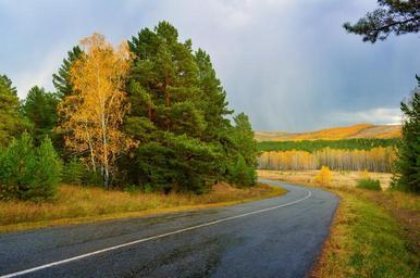 Keywords: autumn asphalt road landscape forest birch tree yellow cloudy bright wet
