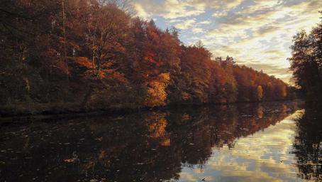 Keywords: autumn colorful golden autumn color landscape autumn forest pond mirroring dusk forests lighting setting sun
