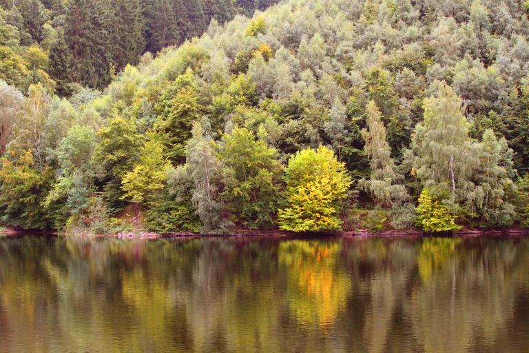 Keywords: autumn fall foliage golden autumn leaves leaves in the autumn forest colorful green background landscape lake nature tree trees mirroring mood peaceful lichtspiel water waters light reflections seascape water reflection autumn trees eifel rursee germany