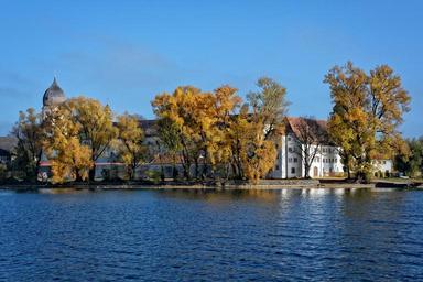 Keywords: autumn ladies island monastery frauenwörth monastery benedictine chiemsee upper bavaria chiemgau bavaria lake water sky landscape distant bank view island