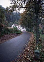 Keywords: road autumn scenic outdoor fog tree foliage natural vibrant park perspective green travel vivid yellow leaf bright oaks fogy scenery orange grass maple serene countryside season flora wood stem october forest