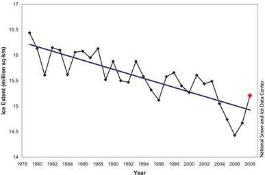 | Keywords: Average March Arctic sea ice extent for 1979 through 2008.png en March 2008 compared to Marches past March 2008 monthly maximum extent was 780 000 square kilometers 301 000 square miles greater than the past record low set in March 2006 but 540 000 square kilometers 208 000 square miles less than the 1979 to 2000 mean Including 2008 the linear trend for March indicates that the Arctic is losing an average of 44 000 square kilometers 17 000 square miles of ice per year in March Although March 2008 extent is greater than in recent years the setup looks right for another dramatic ice loss this summer http //nsidc org/arcticseaicenews/2008/040708 html National Snow and Ice Data Center 2008-04 PD-USGov Trend analysis Ecological trends |