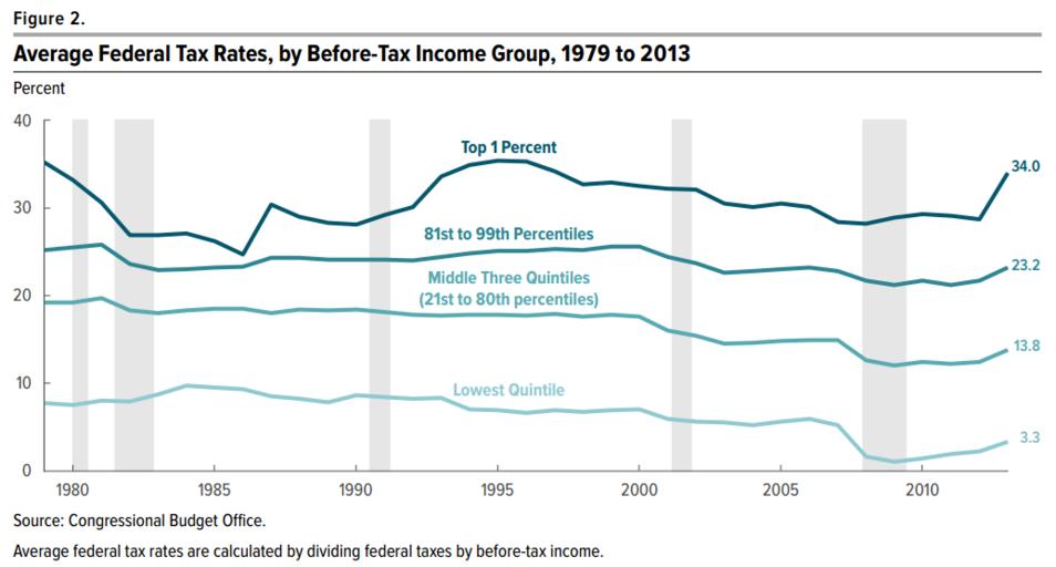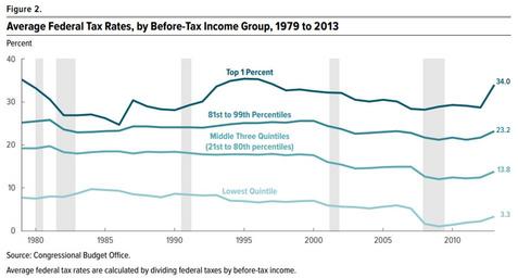 | Keywords: Average US Federal Tax Rates 1979 to 2013.png Understanding the chart President Obama's tax increases on the highest income taxpayers raised their effective tax rates for 2013 There were two primary increases Expiration of the Bush tax cuts of 2001 and 2003 for the top 1 of taxpayers income over 400 000 or 450 000 for married filing tax returns jointly Payroll tax increases on incomes over 200 000 roughly the top 5 as part of the Affordable Care Act Obamacare Uploaded with en wp UW marker 2014 01 06 December 2013 Chart from the US Congressional Budget Office depicting tax rates by income group from 1979 to 2010 and implications for tax rates based on 2013 law https //www cbo gov/publication/51361; prior version at http //cbo gov/publication/44604 2013-12-04 US Congressional Budget Office publication 44604 Taxes PD-USGov |