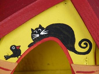 Keywords: aviary home bird feed roof red yellow wood painted paint color cat black