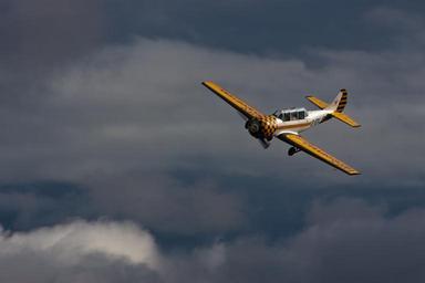 Keywords: aviation plane two seater stunt yellow white clouds sky propeller stowe maries airfield