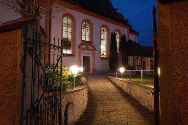 Keywords: away goal intake input church steeple at night illuminated evangelical parish st franziskus er singing st franziskus church