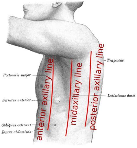 | Keywords: Axillary lines.svg Surface anatomy of Axillary lines own Made in Inkscape ;Background image File Gray1215 png ;References Images at Cosmeticsurg net > Breast augmentation with twilight anesthesia -a safer choice March 14 2009 http //www cosmeticsurg net/blog/wp-content/uploads/2009/03/nerves002 jpg The University of Glasgow http //www gla ac uk/media/media_52670_en jpg Mikael Häggström 2010-03-21 <gallery>File Axillary lines png PNG-format</gallery> Gray's Anatomy plate Surface anatomy | ||||
