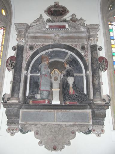 Keywords: AyshfordMonumentBurlescombe.jpg en Ayshford Mural monument Burlescombe Church Devon Text incised on slate tablet on monument To the memory of Elizabeth Ayshford wife of Arthur Ayshford eldest sonne of Henry Ayshford Esquier only daughter of the right honourable Charles Lord Wilmot Viscount of Atllone i e Athlone late general of his majesties forces in the kingdome of Ireland now a privy counceller both of England Ireland She dyed the 23th sic yeare of her age Anno D omi ni 1635 June 13 o own Unknown sculptor 1635 St Mary the Virgin's church Burlescombe Wall mounted church monuments in Devon |