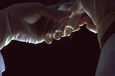 | Keywords: Azt (1).jpg A close-up of scientist's hands holding three test tubes The one on the left contains normal healthy t-lymphocytes notice the pellet on the bottom The middle vial has t-cells that have been infected with the AIDS virus HIV also known as HTLV-III; note the pellet has been destroyed since the cells have died The test tube on the right contains t-lymphocytes that were exposed to the AIDS virus but since they were protected by AZT the cells were not destroyed and the pellet stayed intact Topics/Categories Cancer Types -- AIDS-Related Science and Technology -- Laboratory Techniques/Equipment Type Color Photo Source National Cancer Institute John Crawford Photographer 2249 1986-09 Reuse Restrictions None - This image is in the public domain and can be freely reused Please credit the source and/or author listed above John Crawford Photographer PD-USGov-HHS-NIH Media from National Cancer Institute Visuals Online Images uploaded by Fæ Test tubes |