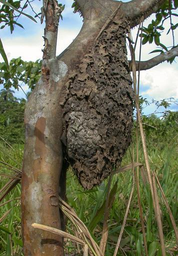 Keywords: Azteca ant nest.jpg en A carton nest of Azteca ants hangs from a guayaba tree in Archidona Ecuador 2003-12-10 15 36 59 own Alex Wild -0 9023 -77 8048 cc-zero Uploaded with UploadWizard Ant nests