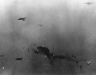 The aircraft which caused the first impact was that of 1LT John Micheal, 364th Sqn, aboard 43-38133 WF-E. Micheal's plane was seen to try and avoid a collision by turning away in a steep banking maneuver. This came too late and an on coming B-17 (number 43-38030 JJ-E 'My Achin' B')) was witnessed to clip a large section of the left wing of 133 off. This and other large pieces of debris caused chaos throughout the remaining formation, with aircraft desperately trying to duck and weave, and still maintain some kind of safe order in such poor visibility.