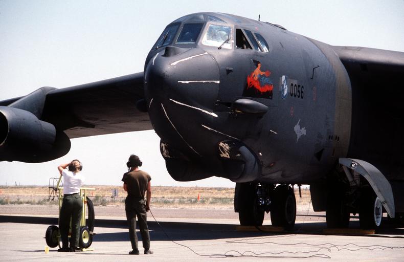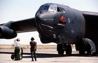 | Keywords: B-52H Nemesis Nose Art.jpeg en Ground crew members stand by as a 410th Bombardment Wing B-52H Stratofortress aircraft at Mountain Home Air Force Base Idaho undergoes a preflight inspection prior to taking part in exercise Mighty Warrior '88 Nose art on the plane is entitled Nemesis 1988-08-11 NARA-image 6462603 SSGT Kevin Hoeth PD-USGov Boeing B-52H Nose art on B-52 |