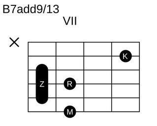 Keywords: B-Dur-7add9-13.svg Eigenanfertigung 2006-02-11 own assumed Red Rooster Guitar chords in standard tuning