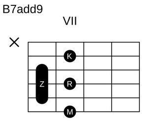 Keywords: B-Dur-7add9.svg Eigenanfertigung 2006-02-11 own assumed Red Rooster Guitar chords in standard tuning