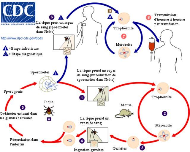 | Keywords: Babesia LifeCycle(French version).png The life cycle of Babesia' the causal agents of en Babesiosis Babesia_LifeCycle French_version GIF Traduction en français des légendes de l ™image suivante Babesia_LifeCycle GIF The Babesia microti life cycle involves two hosts which includes a rodent primarily the white-footed mouse Peromyscus leucopus During a blood meal a Babesia-infected tick introduces sporozoites into the mouse host Sporozoites enter erythrocytes and undergo asexual reproduction budding In the blood some parasites differentiate into male and female gametes although these cannot be distinguished at the light microscope level The definitive host is a tick in this case the deer tick Ixodes dammini I scapularis Once ingested by an appropriate tick gametes unite and undergo a sporogonic cycle resulting in sporozoites Transovarial transmission also known as vertical or hereditary transmission has been documented for large Babesia spp but not for the small babesiae such as B microti Humans enter the cycle when bitten by infected ticks During a blood meal a Babesia-infected tick introduces sporozoites into the human host Sporozoites enter erythrocytes and undergo asexual replication budding Multiplication of the blood stage parasites is responsible for the clinical manifestations of the disease Humans are for all practical purposes dead-end hosts and there is probably little if any subsequent transmission that occurs from ticks feeding on infected persons However human to human transmission is well recognized to occur through blood transfusions Note Deer are the hosts upon which the adult ticks feed and are indirectly part of the Babesia cycle as they influence the tick population When deer populations increase the tick population also increases thus heightening the potential for transmission Obtained from the CDC http //phil cdc gov/phil/home asp Public Health Image Library Image credit CDC/Alexander J da Silva PhD/Melanie Moser PHIL 3378 2002 Originally from http //www dpd cdc gov/DPDx/HTML/ImageLibrary/Babesiosis/ Babesia_LifeCycle GIF here phil PD-USGOV-HHS-CDC PD-USGov-HHS-CDC Parasitic diseases Babesia life cycle __NOTOC__ PD-USGov Original upload log wikitable - - 2007-05-19 07 19 38 544 × 435 29071 bytes Toxicotravail <nowiki> The life cycle of Babesia' the causal agents of en Babesiosis Babesia_LifeCycle French_version GIF Traduction en français des légendes de l ™image suivante Babesia_LifeCycle GIF The Babesia mic</nowiki> CDC lifecycles |