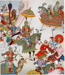 | Keywords: Babur setting out with his army.jpg en Racinet's view of Babur setting out with his army 1876 ; a larger scan Source ebay Jan 2002 Color Lithograph from 1876 Military Costumes of India - 16th Century Legend 'These fragments are taken from a 16th C painting representing Djahir - El-din Mohammed Bâber nicknamed the Tiger the king and emperor of India leaving at the head of his army to invade the province of Mazindera in Persia He was the Indian emperor 1526-30 and founder of the Mughal dynasty of India a descendant of the Mongol conqueror Genghis Khan and also of Timur Tamerlane He was a military adventurer and soldier of distinction and a poet and diarist of genius as well as a statesman Babur is rightly considered the founder of the Indian Mughal Empire even though the work of consolidating the empire was performed by his grandson Akbar Babur moreover provided the glamour of magnetic leadership that inspired the next two generations Babur was a military adventurer of genius an empire builder of good fortune and an engaging personality He was also a Turkey poet of considerable gifts that would have won him distinction apart from his political career He was a lover of nature who constructed gardens wherever he went and complemented beautiful spots by holding convivial parties Finally his prose memoirs the Babur-nameh have become a world classic of autobiography They were translated from Turki into Persian in Akbar's reign 1589 and were translated into English in two volumes in 1921-22 with the title Memoirs of Babur They portray a ruler unusually magnanimous for his age cultured witty convivial and full of good fellowship and adventurous spirit with a sensitive eye for natural beauty In this print the Mogul is represented with all the attributes of the ruler especially the parasol carried over him He is wearing a silk jacket short sleeved and a round shaped skirt with ornamental design and large metal button-plate on his chest The jacked is padded to protect against the arrows and his knees are also protected by metal plates In his right hand he is holding one of the offensive weapons of the time a spear with ends being finished with decorated metal on the left side he wears a saber and on his belt a quiver with feather arrows is attached The soldier behind him carries a hammer like weapon which could also be a heavy wood club he is holding it with both his hands indicating the heaviness of the weapon The mogul's horse is entirely protected with armor of overlapped blades An interesting feature is that he does not were the rider's boots but his personal slippers Another interesting feature of this painting is the lack of elephants in his army Before the ruler we see a number of infantrymen who proceed him and by shouting create a necessary room for him to pass 1876 http //www columbia edu/itc/mealac/pritchett/00routesdata/1600_1699/french/racinet/racinet html Racinet other versions Custom license marker 2015 11 09 PD-Old Mughal Empire Uploaded with UploadWizard |
