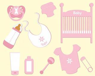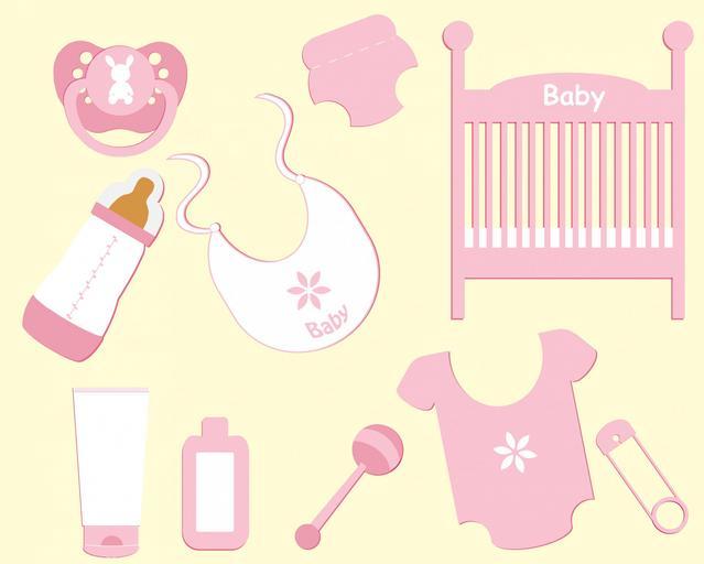Keywords: baby girl accessories elements bib soother pacifier dummy crib cot bottle milk bottle feeding bottle lotion cream pin safety pin rattle pink onesie top vest art illustration scrapbooking