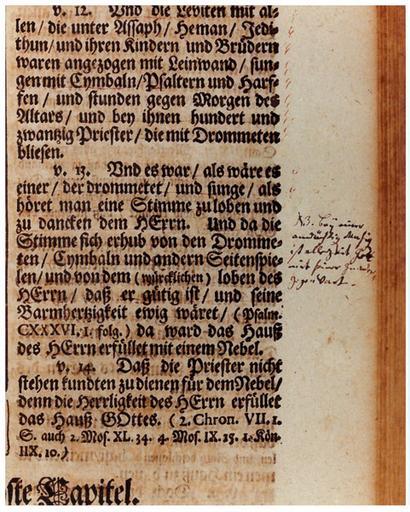 | Keywords: Bach Calov-Bibel 2 Chr 5,13.jpg de <poem>2 Chronik 5 13 à bersetzung Martin Luther v 13 Und es war/ als wäre es einer/ der drommetet/ und sunge/ als höret man eine Stimme zu loben und/ zu dancken dem HErrn Und da die Stimme sich erhub von den Dromme ten/ Cymbaln und andern Seitenspie len/ und von dem würcklichen loben des HErrn/ daß er gütig ist/ und seine Barmhertzigkeit ewig wäret/ Psalm CXXXVI I folg da ward das Hauß des HErrn erfüllet mit einem Nebel mit Johann Sebastian Bachs eigenhändiger Randbemerkung Nota Bene Bey einer andächtigen Musiq ist allezeit Gott mit seiner Gnaden Gegenwart</poem> Aus Johann Sebastian Bachs Exemplar der Calov-Bibel in Besitz des Concordia Seminary in St Louis Missouri - http //bach csl edu/media/calov before 1750 http //bach csl edu/media/calov Martin Luther 1483-1546 Abraham Calov 1612-1686 Johann Sebastian Bach 1685-1750 PD-Art Uploaded with UploadWizard Johann Sebastian Bach Abraham Calov Concordia Seminary |