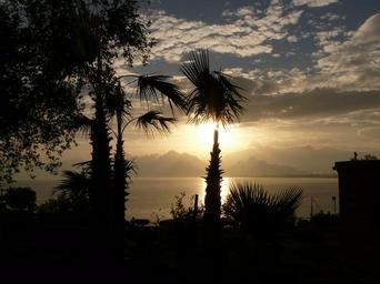 Keywords: back light sunset antalya sea outlook palm trees idyll holiday ocean mountains sunbeam turkey turkish riviera cliff