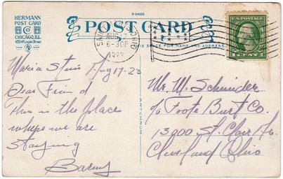 | Keywords: maria stein, ohio mariasteinohio saint marys, ohio saintmarysohio ohio postcard stamp postmarked 1923 hermann post card co. hermannpostcardco artchrom divided back dividedback white border era whiteborderera white border whiteborder schwidele 1920s flag cancel flagcancel maria stein mariastein st. marys stmarys st. marys, ohio stmarysohio saint marys saintmarys cancel text writing document Description on front of card: Mother House and Relic Chapel of the Sisters of the Precious Blood, Maria Stein, Ohio. Publisher: Hermann Post Card Co., 4333 N. Lincoln Street, Chicago, Ill. Postmark on card: Aug 17, 1923 6:30 p.m. Message: Maria Stein Aug 17-23 Dear Friend, This is the place where we are staying. Barney Addressed to: Mr. W. Schwidele c/o Foote Burt Co. 13000 St. Clair Av. Cleveland, Ohio Description on front of card: Mother House and Relic Chapel of the Sisters of the Precious Blood, Maria Stein, Ohio. Publisher: Hermann Post Card Co., 4333 N. Lincoln Street, Chicago, Ill. Postmark on card: Aug 17, 1923 6:30 p.m. Message: Maria Stein Aug 17-23 Dear Friend, This is the place where we are staying. Barney Addressed to: Mr. W. Schwidele c/o Foote Burt Co. 13000 St. Clair Av. Cleveland, Ohio |