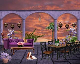 Keywords: background environment portico patio balcony landing arches arcade sunset living dining purple lavender orange wisteria plants table sofa cat dog garden outdoor landscape