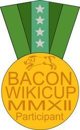 | Keywords: Bacon WikiCup 2012 Medal.svg A medal awarded to all participants in the Bacon WikiCup 2012 an event that occurred during the Bacon Challenge 2012 own / Derived from Crudeboar svg Public Domain 2013-12-09 Kevin Payravi Wikimedia Commons Inkscape 2012 medals SVG medals |