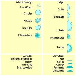 Keywords: Bacterial colony morphology.png Adapted and redrawn from Seeley HW Vandemark PJ 1962 Microbes In Action A laboratory manual of microbiology WH Freeman San Francisco London 2007-01-09 own assumed Ewen Microbiological cultures
