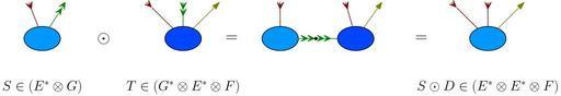 | Keywords: Bacterial-tensor-contracted-product.svg en Contracted product of two tensors fr Produit tensoriel contracté de deux tenseurs 2013-02-01 Own Thomas Douillard File Bacterial-tensor-contracted-product png Other fields Graphviz Digraph f node lblstyle font \huge subgraph G1 rankdir TB rotation 10 subgraph G11 node style invisible label shape none rankdir LR ; rank same ; a1 a2 lbla label S C E G shape none texlbl S \in E \otimes G rank same a label style filled fillcolor 0099ff ab label shape none texlbl \odot lblstyle font \Huge a1->a color 800000 arrowtail crow dir back a->a2 arrowhead veevee color 008000 ; a-> lbla style invisible arrowhead none ; subgraph G2 rankdir TB subgraph G21 rankdir LR ; rank same ; node style invisible label shape none b1 b2 b3 rank same b label style filled fillcolor 0047ff bc label texlbl lblstyle font \Huge shape none lblb label TinG E F shape none texlbl T \in G \otimes E \otimes F b-> lblb style invisible arrowhead none b1->b arrowtail crow dir back color 800000 ; b2->b arrowtail crowcrow dir back color 008000 ; b->b3 color 808000 ; ; subgraph G3 rankdir TB subgraph G31 rankdir LR ; rank same ; node style invisible label shape none c1 c3 c4 subgraph c rank same ca label style filled fillcolor 0099ff c2 style invisible shape point cb label style filled fillcolor 0047ff cd label texlbl lblstyle font \Huge shape none c1->ca arrowtail crow dir back color 800000 ; ca->c2 arrowhead veevee color 008000 ; c2->cb arrowtail crowcrow dir back color 008000 ; c4->cb arrowtail crow dir back color 800000 ; cb->c3 color 808000 ; ; subgraph G4 rankdir TB subgraph G41 rankdir LR ; rank same ; node style invisible label shape none d1 d2 d3 rank same da label style filled fillcolor 0099ff lbld label S D in shape none texlbl S\odot D \in E \otimes E \otimes F da -> lbld style invisible arrowhead none d1->da arrowtail crow dir back color 800000 d2->da arrowtail crow dir back color 800000 da->d3 color 808000 ; ; Graphviz dot code + With following toolchain syntax2 tex dot2tex -tmath --preproc --usepdflatex base dot ”ƒ dot2tex --usepdflatex --crop -d > base tex pdflatex base tex pdf2svg base pdf base svg Cc-zero Linear algebra Images with Graphviz source code |