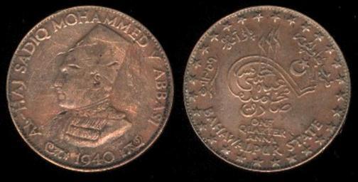 | Keywords: Bahawalpur Quarter Anna.jpg en INDIAN PRINCELY STATE Bahawalpur Now In Pakistan 1/4 Anna Paisa 4 85g Metal Copper Mint Bahawalpur Dated 1359AH 1940 Egde Plain Alignment Medal Obverse Bust of Al-Haj Sadiq Mohammed V Abbasi left Reverse Toughra Ruler Sadiq Mohammed Khan V Abbasi own Aamir me Cc-zero Coins of Bahawalpur |