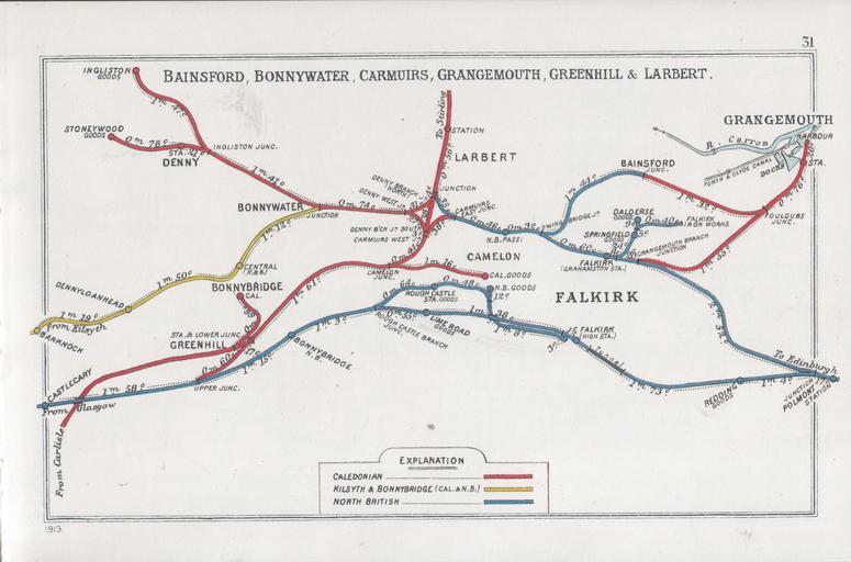 | Keywords: Bainsford, Bonnywater, Carmuirs, Grangemouth, Greenhill & Larbert RJD 31.jpg Pre Grouping railway junction around Bainsford Bonnywater Carmuirs Grangemouth Greenhill Larbert Railway Junction Diagram and 1913 1914 Railway Clearing House Author died more than 70 years ago - public domain PD-old DEFAULTSORT 031 Railways Junctions Diagram 1914 001-040 Dunbartonshire RJD 1914 Stirlingshire RJD 1914 Caledonian Railway RJD Kilsyth and Bonnybridge Joint Railway RJD North British Railway RJD Larbert Grangemouth Greenhill Falkirk Bainsford |
