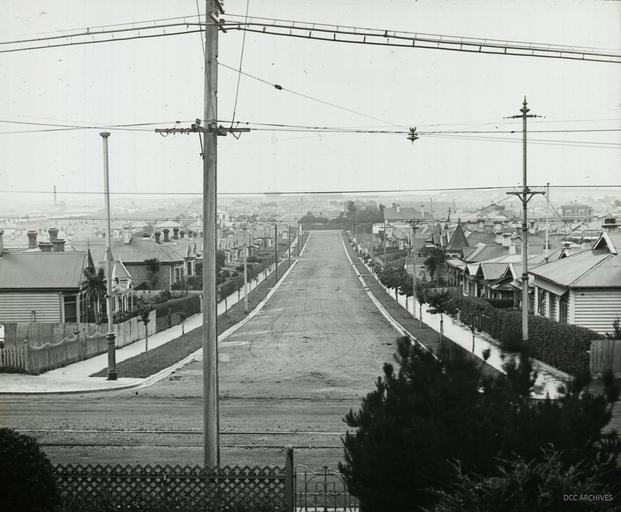 Keywords: caversham dunedin historic road monochrome blackandwhite black and white DCC Archives, Photo 330/5, Street Works - Lantern Slide Collection DCC Archives, Photo 330/5, Street Works - Lantern Slide Collection