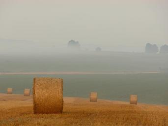 Keywords: bales of straw straw hay field agriculture farm farming rural countryside harvest grey sky fields country grass trees fog mist