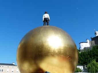 Keywords: balkenhol mozartkugel sphaera golden ball man fig male figure artwork salzburg kapitelplatz austria