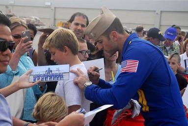 | Keywords: Baltimore Star-Spangled Spectacular airshow 140912-N-UT455-096.jpg en Lt Mark Tedrow assigned to the U S Navy flight demonstration squadron the Blue Angels signs the shirt of a young fan during an autograph session after the Baltimore Star-Spangled Spectacular airshow The Star-Spangled Spectacular which runs Sept 10-16 2014 celebrates the bicentennial of the Battle of Baltimore which provided the inspiration for Francis Scott Key's famous poem Defence of Fort McHenry which later became America's national anthem Along with more than 30 ships from the U S and foreign nations the U S Navy's Blue Angels aircraft will be on display and open to the public U S Navy photo by Mass Communication Specialist 1st Class Larry S Carlson/Released 2014-09-14 Petty Officer 1st Class Larry S Carlson https //www dvidshub net/image/1549534 140912-N-UT455-096 2014-09-15 01 06 BALTIMORE MD US PD-USGov-Military-Navy Blue Angels Images from DoD uploaded by Fæ |