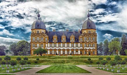 Keywords: bamberg germany seehof palace castle building architecture destinations landmark historic grounds estate grass sky clouds outside hdr