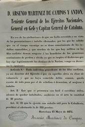 | Keywords: Ban oferint l'indult als voluntaris carlins.jpg ca Ban del general Martínez Campos capità general de Catalunya oferint l'indult als carlins que es presentin amb armes o cavalls Va ser enviat a la majoria dels ajuntaments catalans a les acaballes de la tercera guerra carlina Està datat a Barcelona el 13 de maig de 1875 1875-05-13 http //xac gencat cat/web/ content/xac/01_continguts_arxius_comarcals/ac_valles_oriental/03_documents_escollits_acvo/imatges/fitxers/acvo_ban_guerra_1875 jpg General Martínez Campos capità general de Catalunya other versions PD-old-70-1923 Uploaded with UploadWizard 19th century Barcelona in the 1870s Europe in the 19th century Historical Documents of Catalonia |